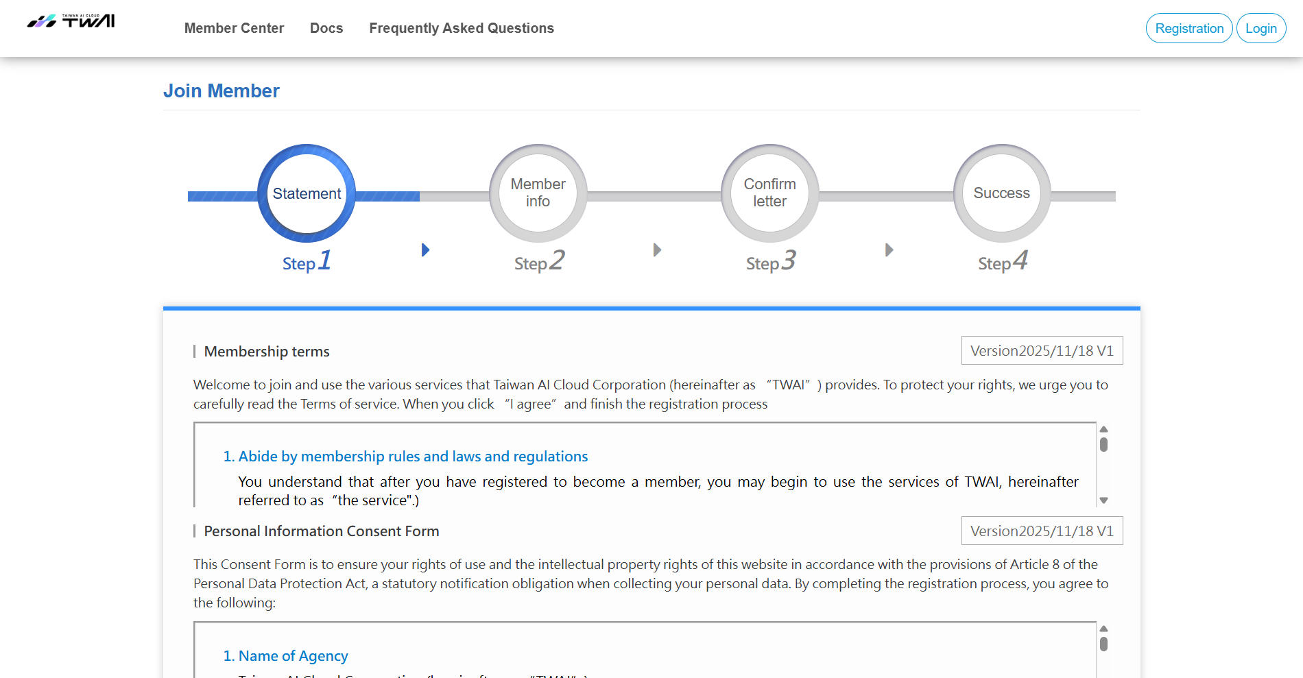 Scroll down to check the box after you read the Membership terms, Personal Information Consent Form, TWAI Platform Terms of Service, and TWAI Service Level Agreement (SLA), and click I agree.